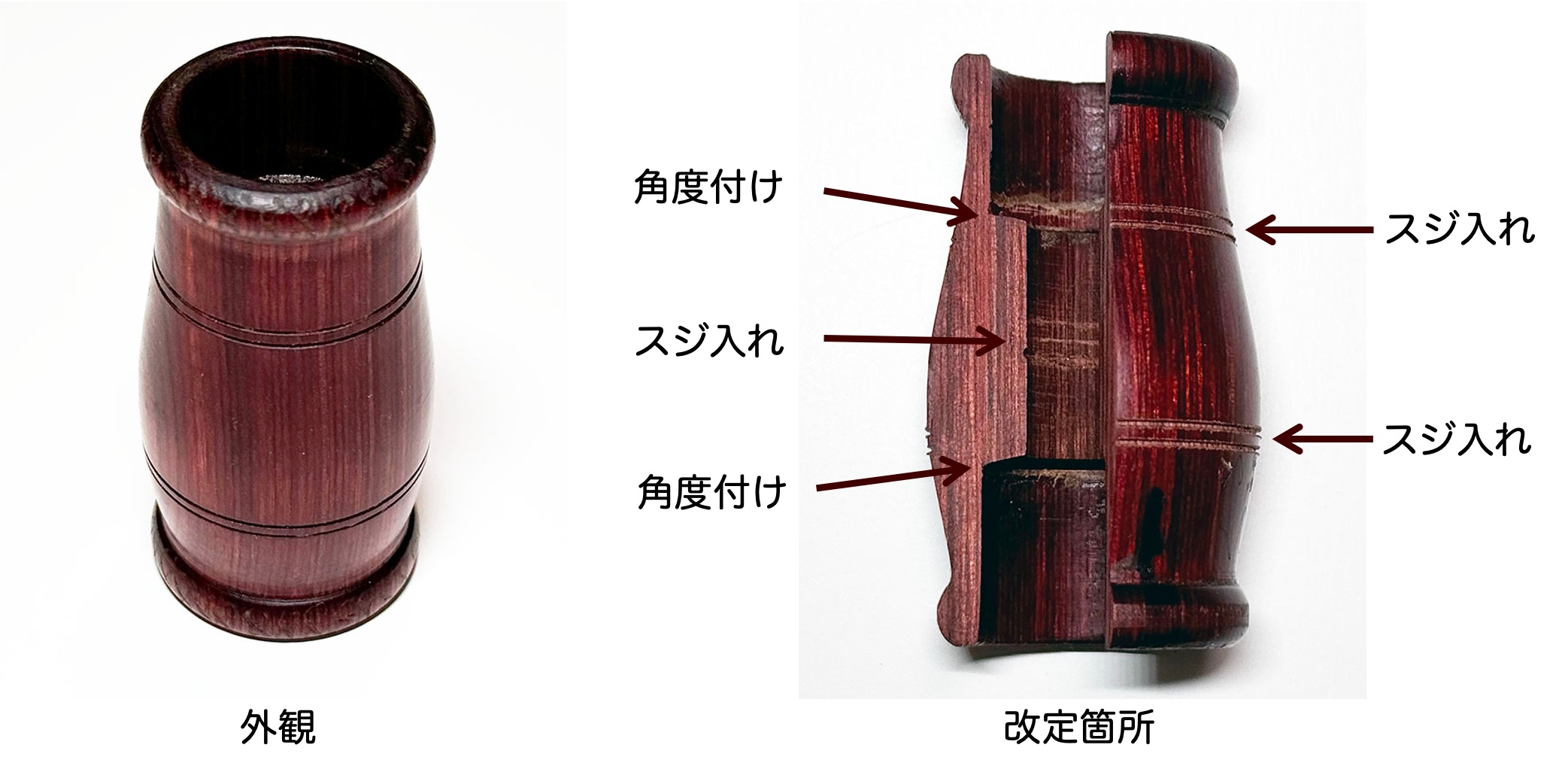 ◎管体の厚さが変化する部分で、管体の内壁と外壁とに、振動の伝わるスピードに差が生じてエネルギーロスが生じていたので、内側端面に角度を付けてスピードを上げ、外側には筋入れをしてスピードを下げるようにしました。また、バレル中間内壁にはスジ入れをしてスピード調整をしました。